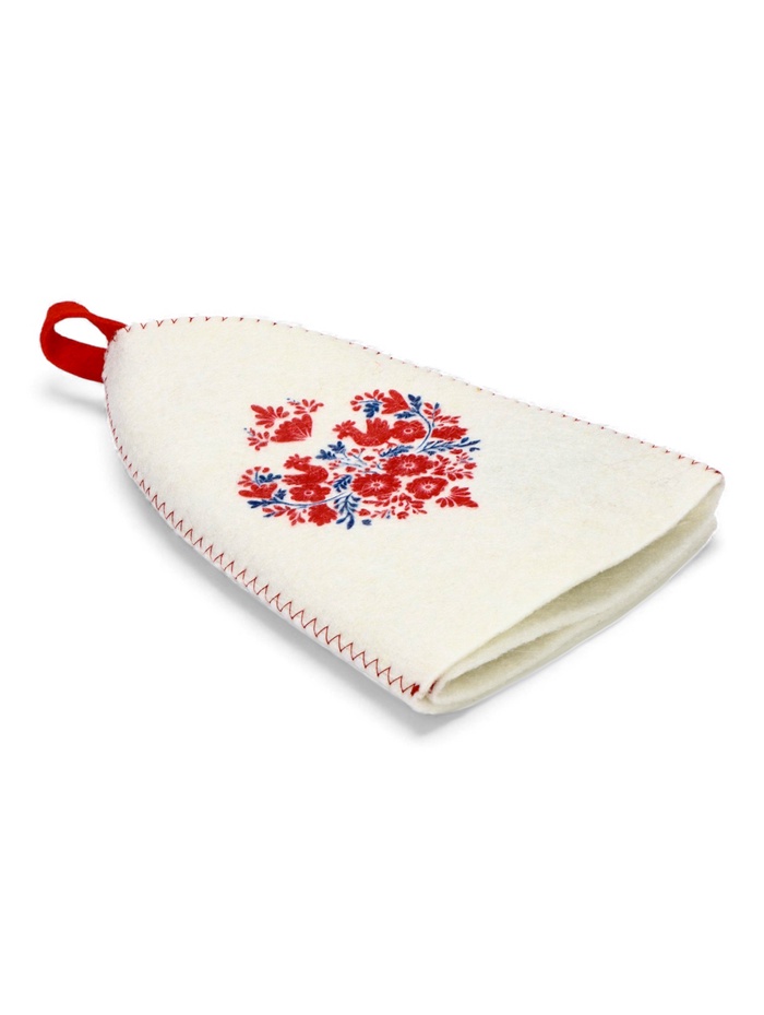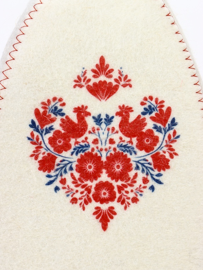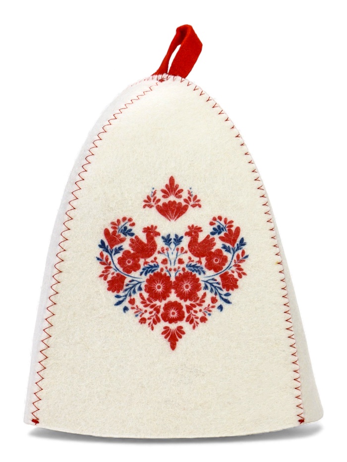 Банная шапка «Славянка» белая из шерсти и полиэфира — аксессуар в народном стиле для комфортного отдыха в парной. Она защищает от жара, а этнический орнамент создаёт особую атмосферу русской бани.