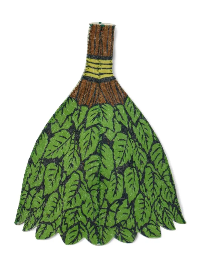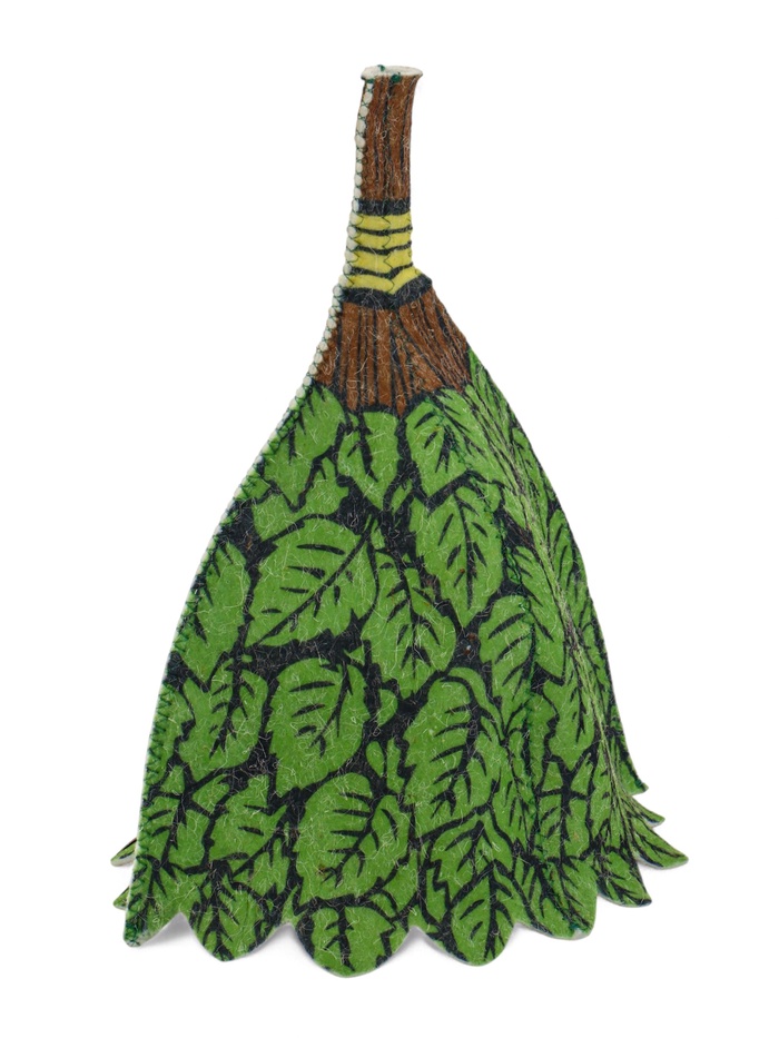 - Яркий принт и фигурный крой: узор не выцветает от высоких температур, а форма веника добавит шапке атмосферности в бане.