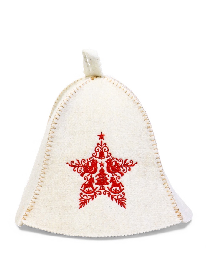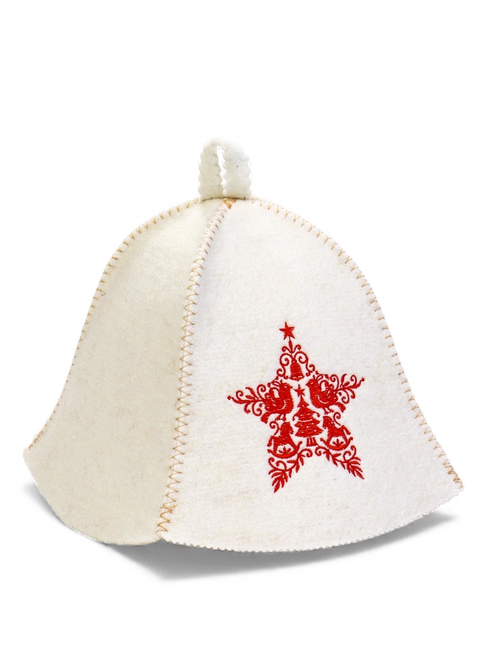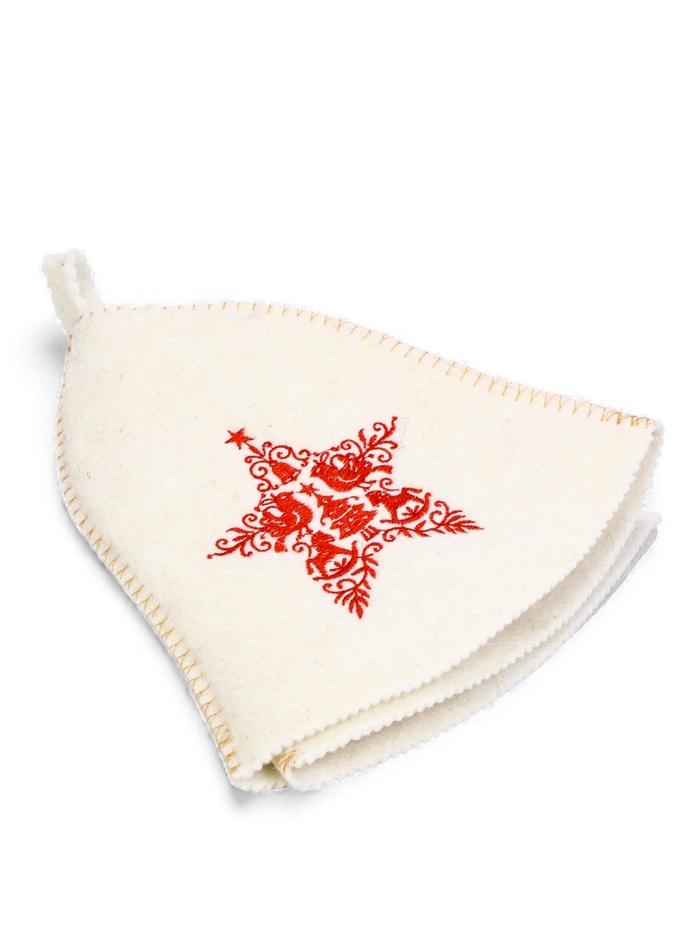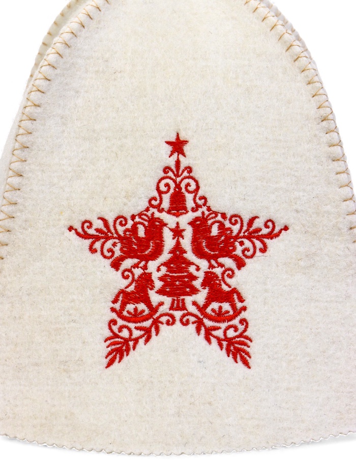 • Красная вышивка «Звезда»: узор выполнен устойчивыми к пару нитями, которые не линяют и не деформируются от жары. Контрастный рисунок хорошо виден на фоне шапки и сохраняет чёткость после многих посещений бани.