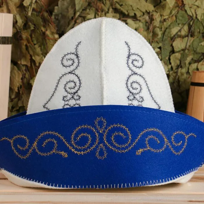 Шапка для бани с вышивкой "Казахстанский колпак мужской" с золотыми и голубыми узорами — Характеристики