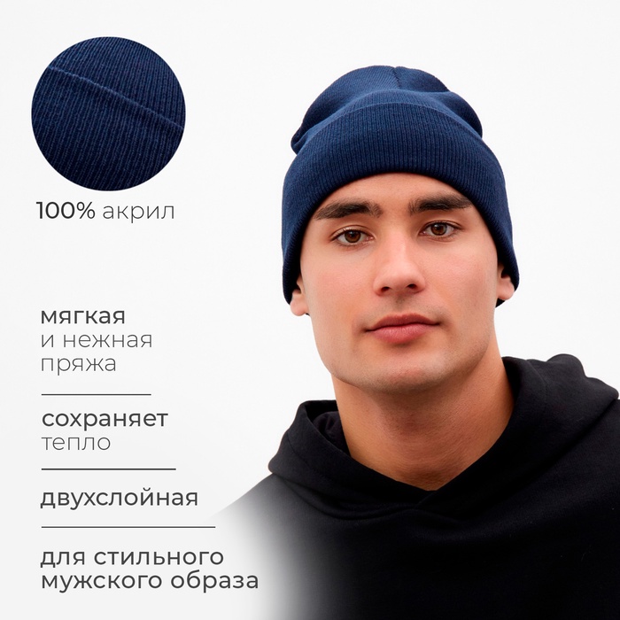 Шапка мужская двухслойная с отворотом, one size, цвет синий — Характеристики