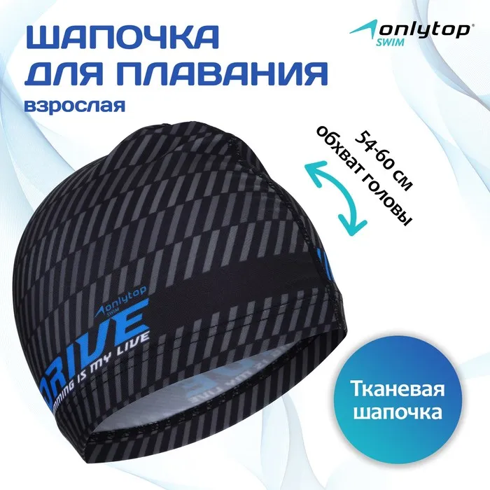 Шапочка для плавания взрослая ONLYTOP DRIVE, тканевая, обхват 54-60 см — Характеристики