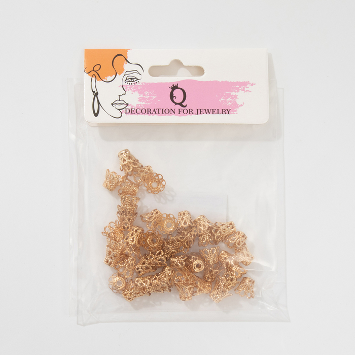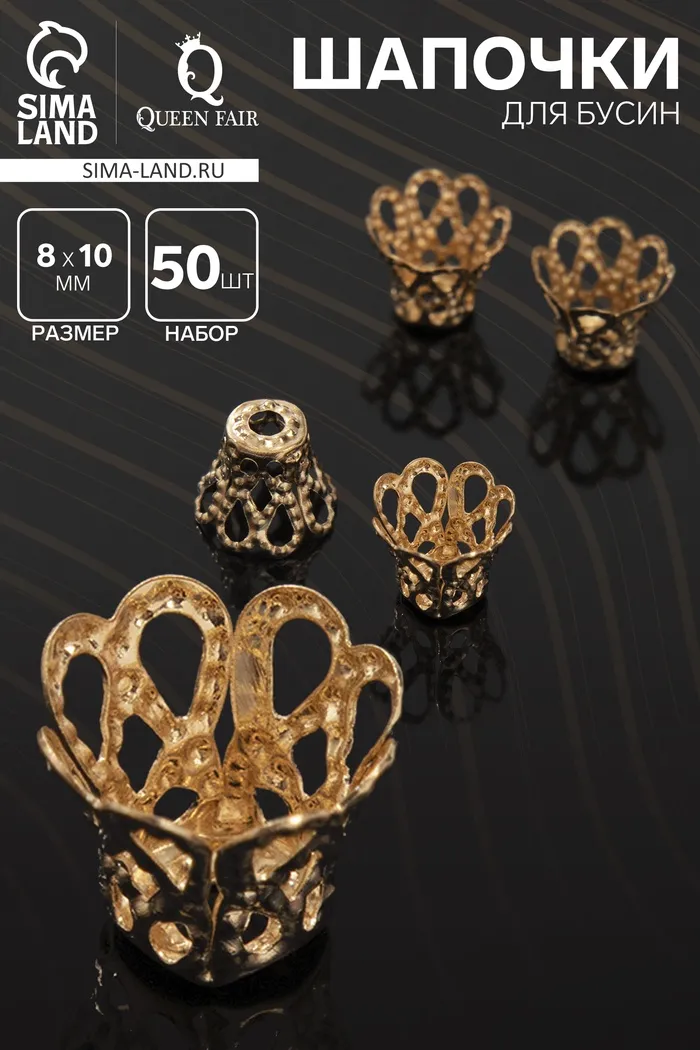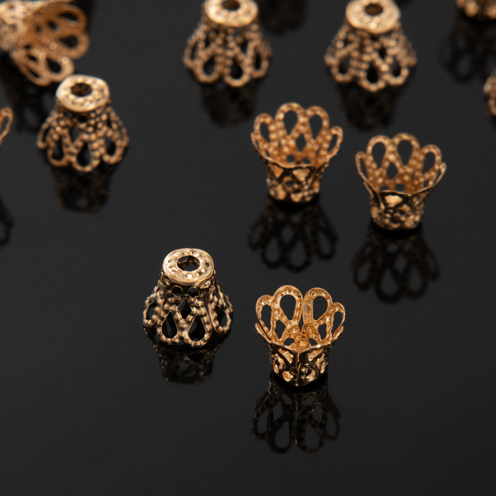 Шапочки для бусин (набор 50 шт.), СМ-091, 8 х 10 мм, цвет золото — это идеальные аксессуары для украшений, которые придадут вашим изделиям стильный и завершённый вид. Шапочки помогают аккуратно скрыть концы нити или проволоки, а также обеспечивают надёжную фиксацию бусин, добавляя элегантности и профессионализма вашим творениям.