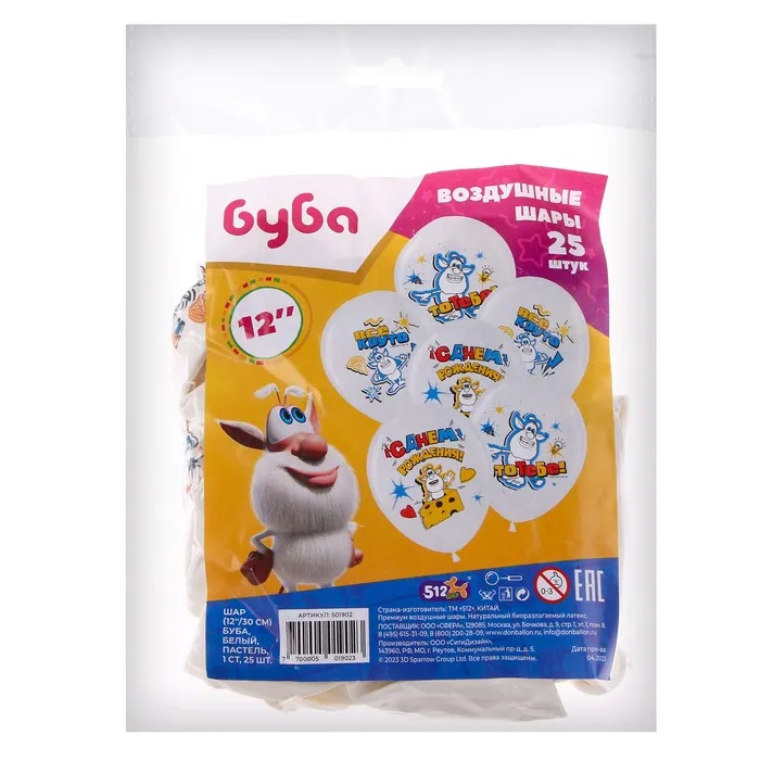 Шар воздушный латексный 12" «Буба», белый, пастель, 1-сторонний, набор 25 шт., МИКС — Характеристики