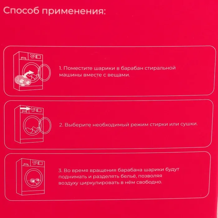 Просто закидываем шарики в барабан машинки во время стирки. Работают они по такому принципу: попадают между стирающимися вещами, поднимают и разделяют их, давая возможность воздуху, воде и чистящему средству свободно циркулировать. Также они ударяются об вещи, как бы «колотят» их, что производит дополнительное механическое воздействие на изделие, улучшает стирку и ускоряет сушку.