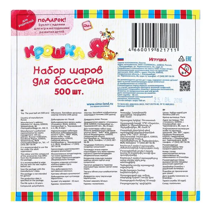 Строгий контроль на всех этапах, начиная от производства, заканчивая упаковкой товара, исключает брак и делает шарики действительно качественными. Стыки деталей обрабатываются вручную, а затем проходят дополнительную проверку на отсутствие острых частей. Имеет сертификат соответствия ЕАС.