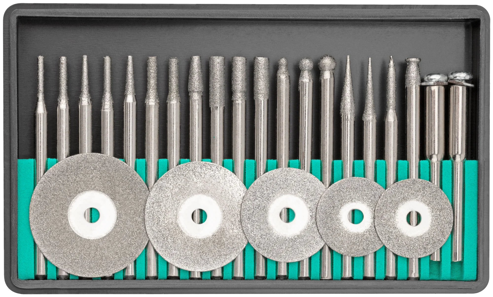 Набор включает в себя шарошки и отрезные круги, выполненные из инструментальной стали с алмазным напылением. Это обеспечивает долговечность и высокую производительность при обработке материалов. Комплект упакован в блистер, что облегчает хранение и транспортировку.