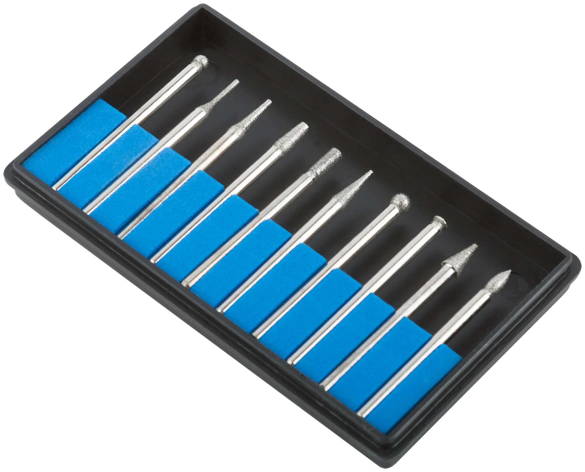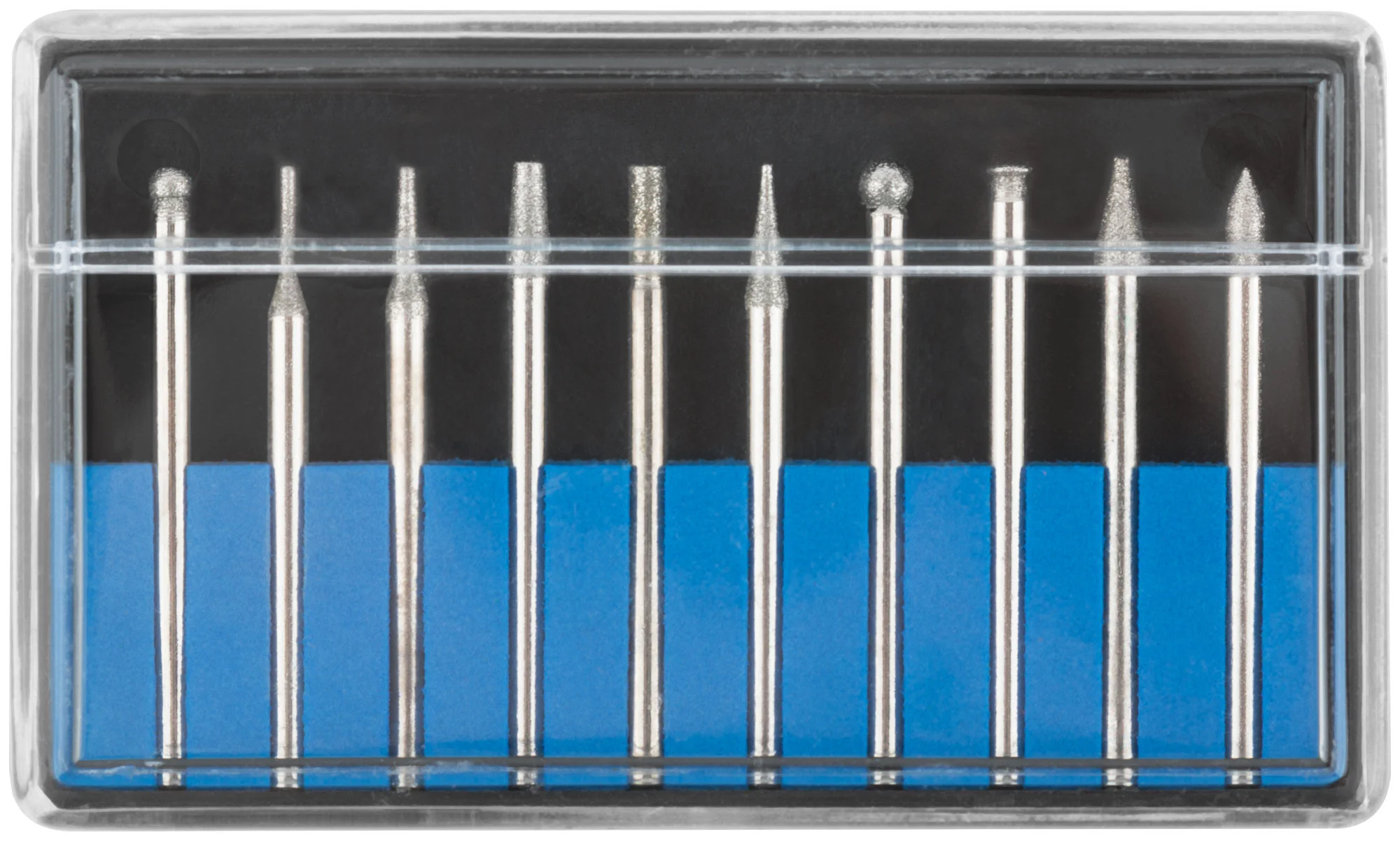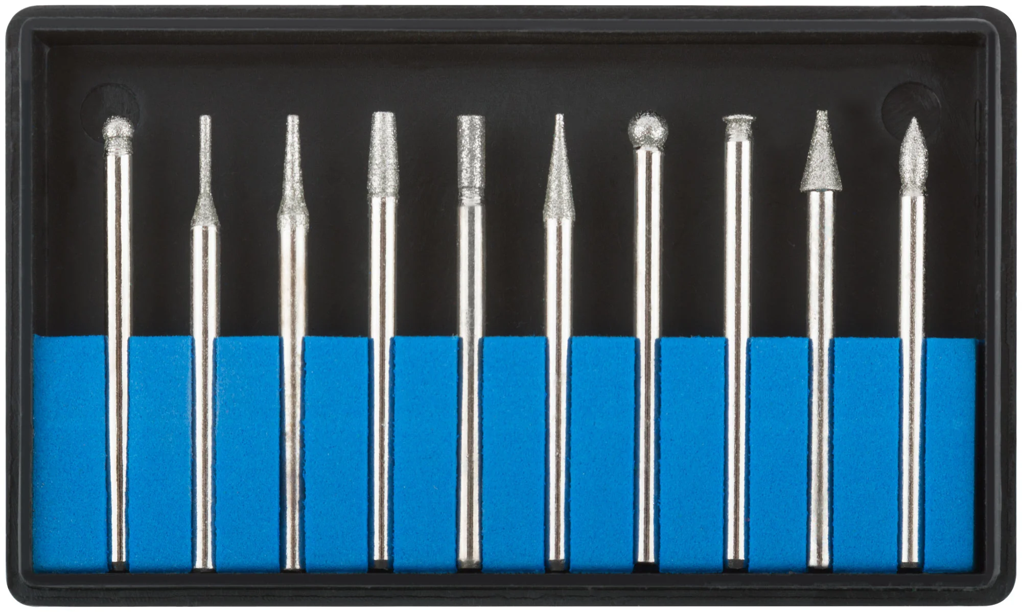 Изготовлены из инструментальной стали с режущей головкой, покрытой техническими алмазами, эти шарошки обеспечивают долговечность и высокую эффективность в работе. Комплект поставляется в удобной пластиковой коробке, что обеспечивает удобное хранение и транспортировку.