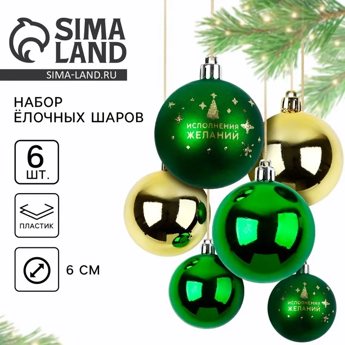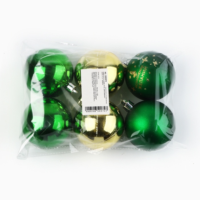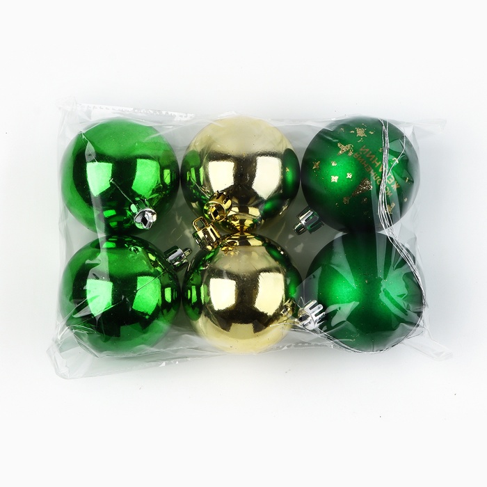Шары ёлочные новогодние, d=6 см, 6 шт., зелёный, золотой
