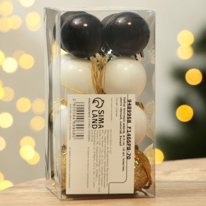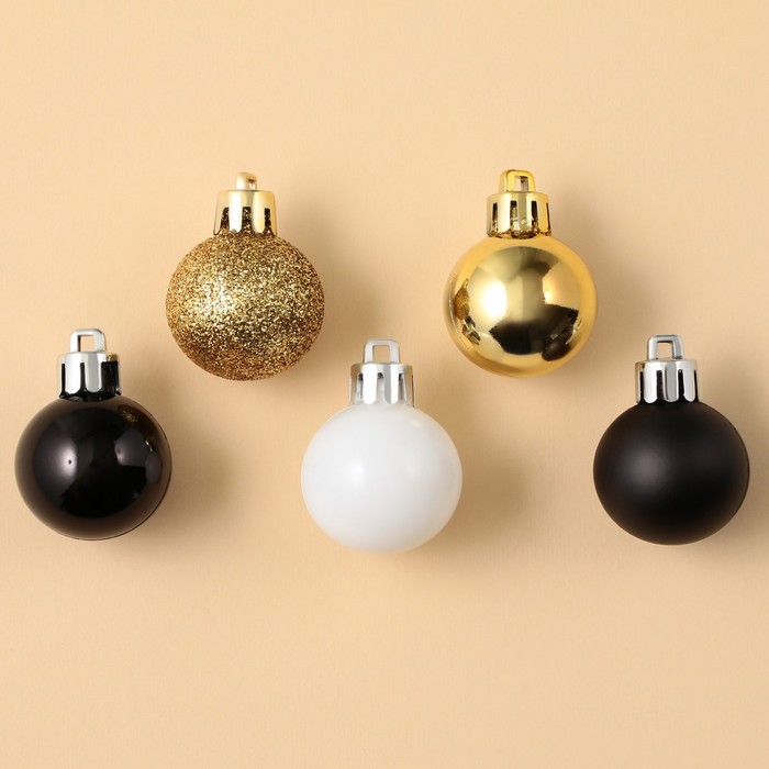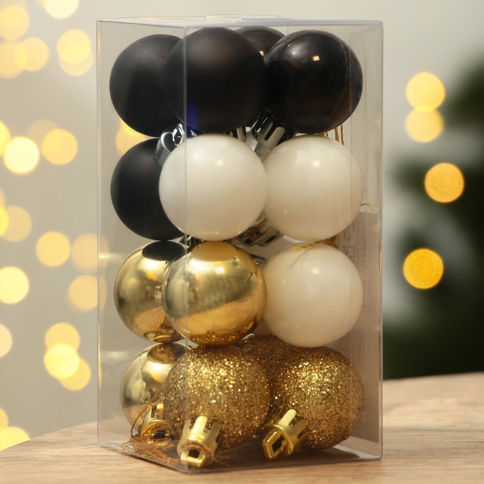 Шары ёлочные новогодние, пластик, d=3 см, 16 шт., чёрные, золотой, белый