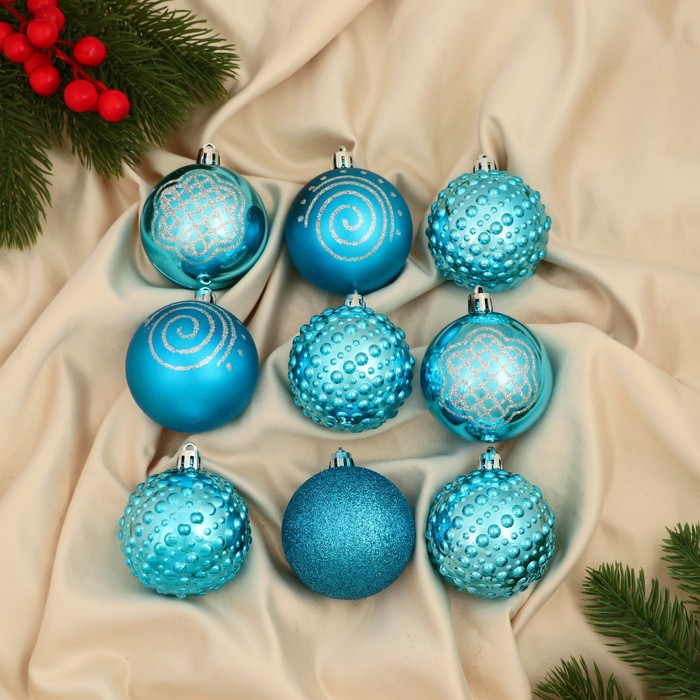 Ёлочные игрушки «Адель», шары новогодние, d=6 см, набор 9 шт., завитки, голубой