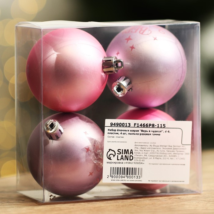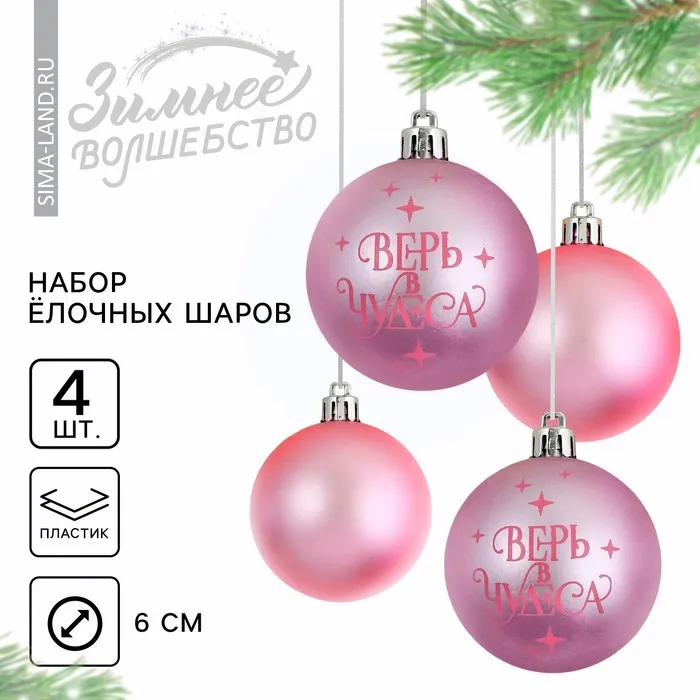 Шары ёлочные новогодние «Верь в чудеса!», пластик, d=6, 4 шт., розовые — Характеристики