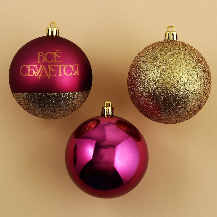 Шары ёлочные новогодние «Всё сбудется!», пластик, d=8, 4 шт., винный, золотой