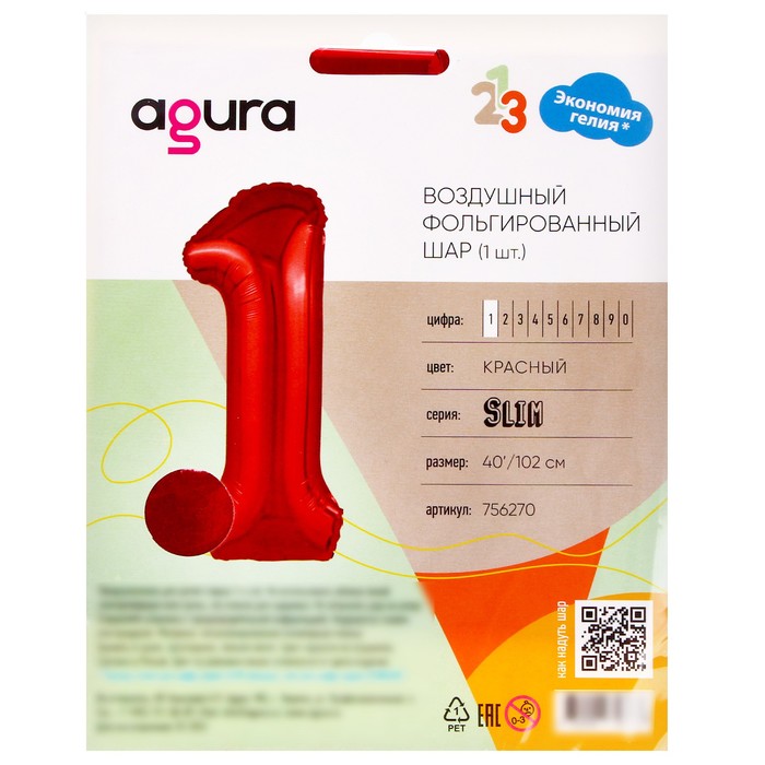 Шары воздушные фольгированные 40" «Цифра 1», цвет красный — Характеристики
