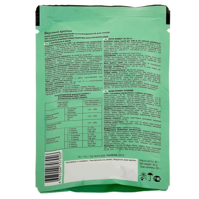 Корм с кроликом в желе — это не только вкусное, но и полезное решение для вашего питомца. Он обеспечивает кошку необходимыми питательными веществами, поддерживая её активность и здоровье. Удобная упаковка позволяет легко контролировать порции и сохранять свежесть продукта. Ваш любимец будет в восторге от нежного вкуса, а вы — от его отличного самочувствия!