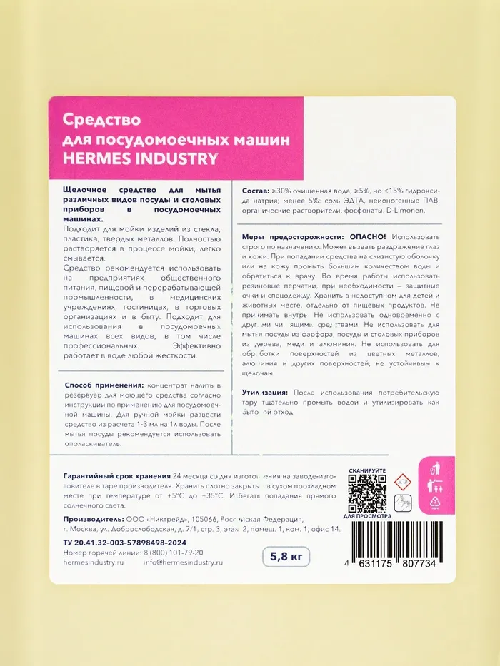 Щелочное средство для посудомоечных машин HERMES INDUSTRY AUTO CROCK HD01, 5,8 кг — это мощное профессиональное средство, предназначенное для эффективного очищения посуды и кухонной утвари в посудомоечных машинах. Разработанное для использования в условиях интенсивной эксплуатации, средство обеспечивает быструю и глубокую очистку от жиров, пригоревших остатков пищи, органических загрязнений и сложных отложений.