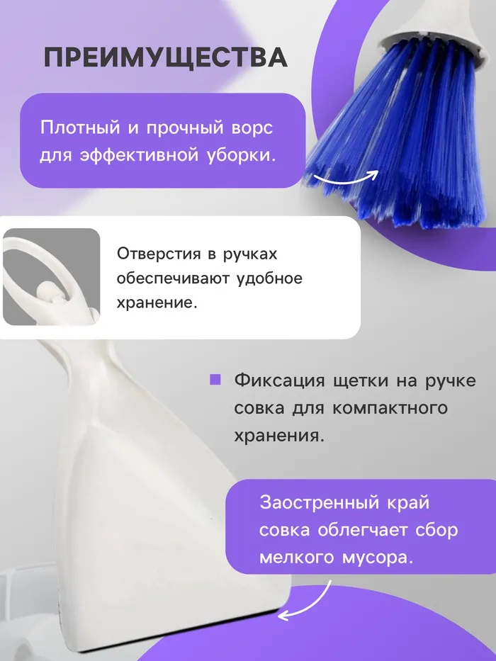 Классический набор из совка и щетки, который удобно хранить в салоне автомобиля, шкафчике на кухне или в санузле. Совок очень глубокий, что позволяет собрать весь мусор за один раз. Идеально подходит для труднодоступных мест.