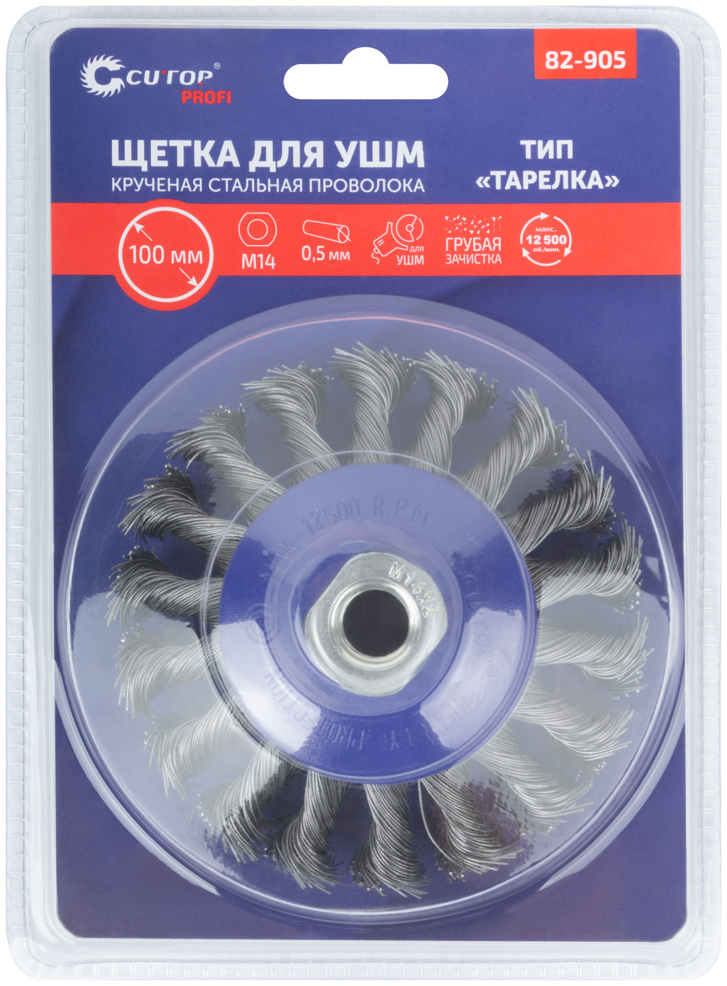 Щетка оснащена креплением М14 и изготовлена из крученой стальной проволоки диаметром 0,5 мм, что обеспечивает её устойчивость к износу и длительный срок службы. Упакована в блистер для удобства хранения и транспортировки.