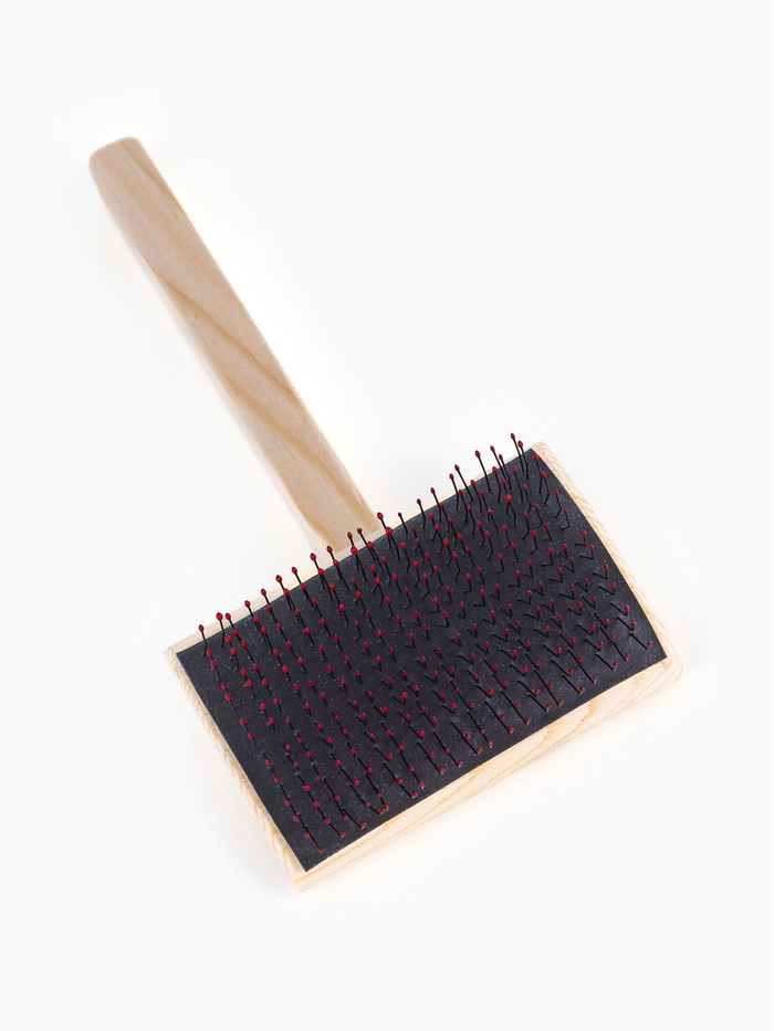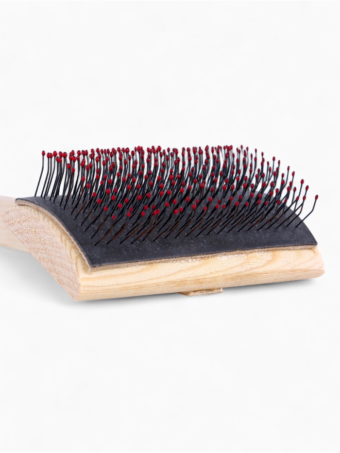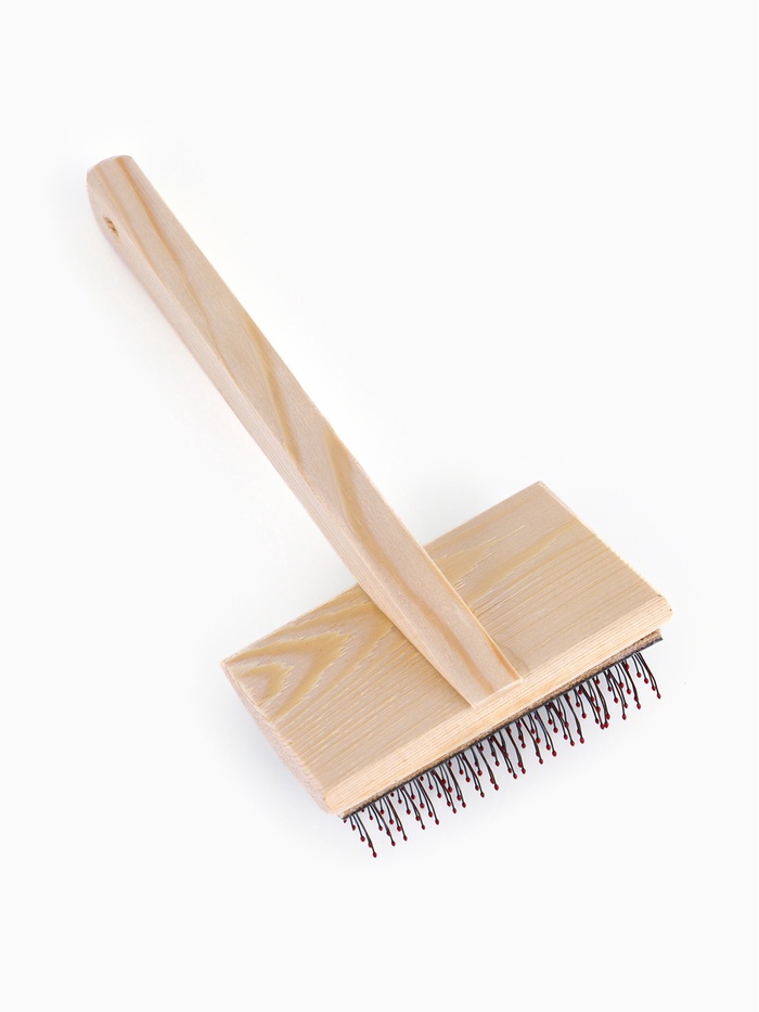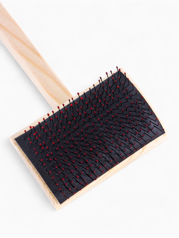 - Дерево от начала до конца: И ручка, и рабочая часть изготовлены из массива дерева без пластика, клея и металлических вставок. Такая конструкция не электризует шерсть, не вызывает аллергии и сохраняет стабильность формы при частом использовании.