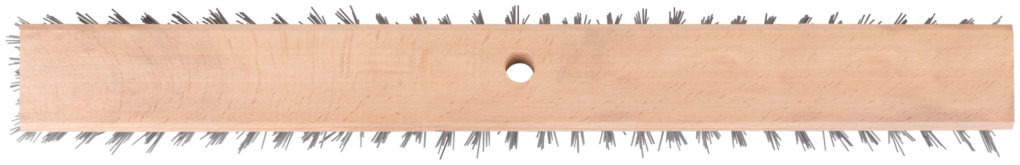 Оснащена жесткой щетиной толщиной от 0,8 до 1,0 мм, закрепленной на деревянной колодке из бука. Пять рядов щетины обеспечивают максимальную эффективность уборки. Щетка имеет посадочное отверстие диаметром 20 мм с резьбой под углом, что позволяет использовать ее с совместимыми черенками (арт. 68018, 68019, 68020).