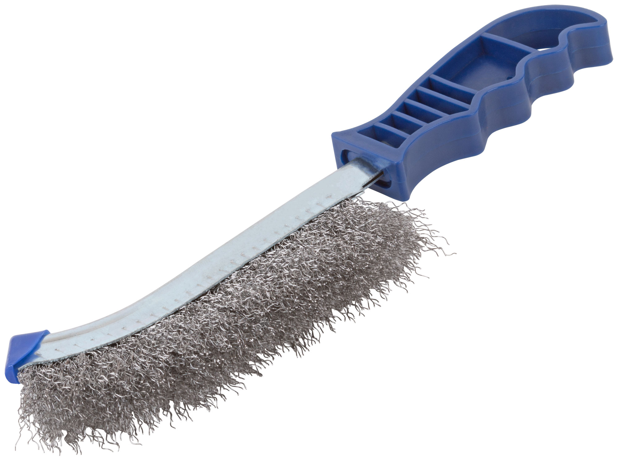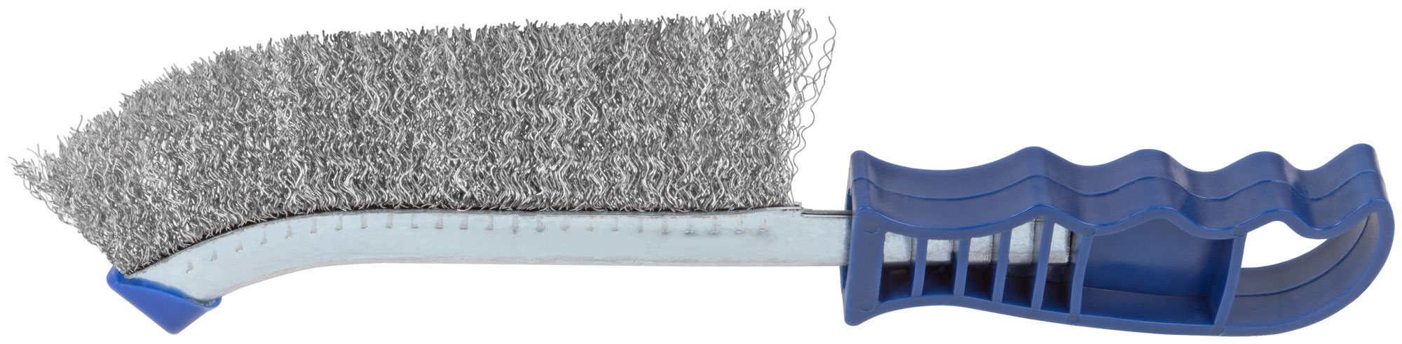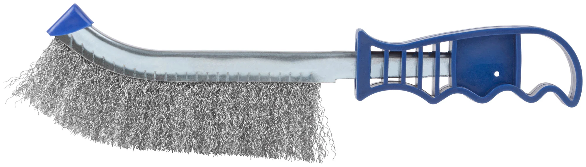 Щетка оснащена ударопрочной пластиковой ручкой, обеспечивающей надежный хват во время работы. Витая проволока 0,3 мм из стали позволяет эффективно удалять загрязнения, сохраняя при этом рабочую поверхность.
