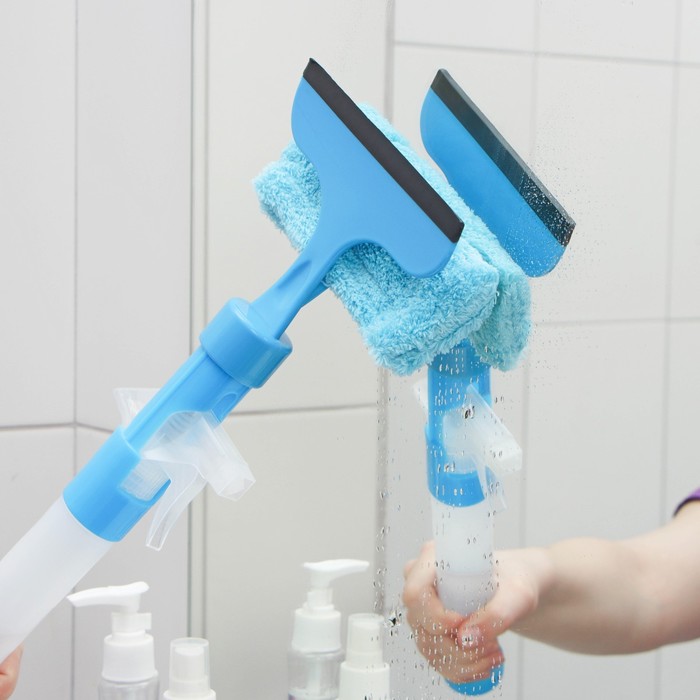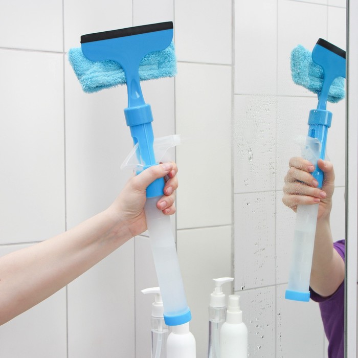 Швабра для мытья окон - это окномойка 3 в 1. Щетка для стекол включает в себя: распылитель, водосгон, насадка из микрофибры.