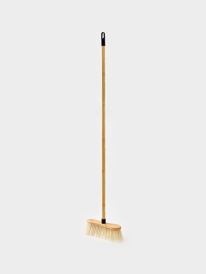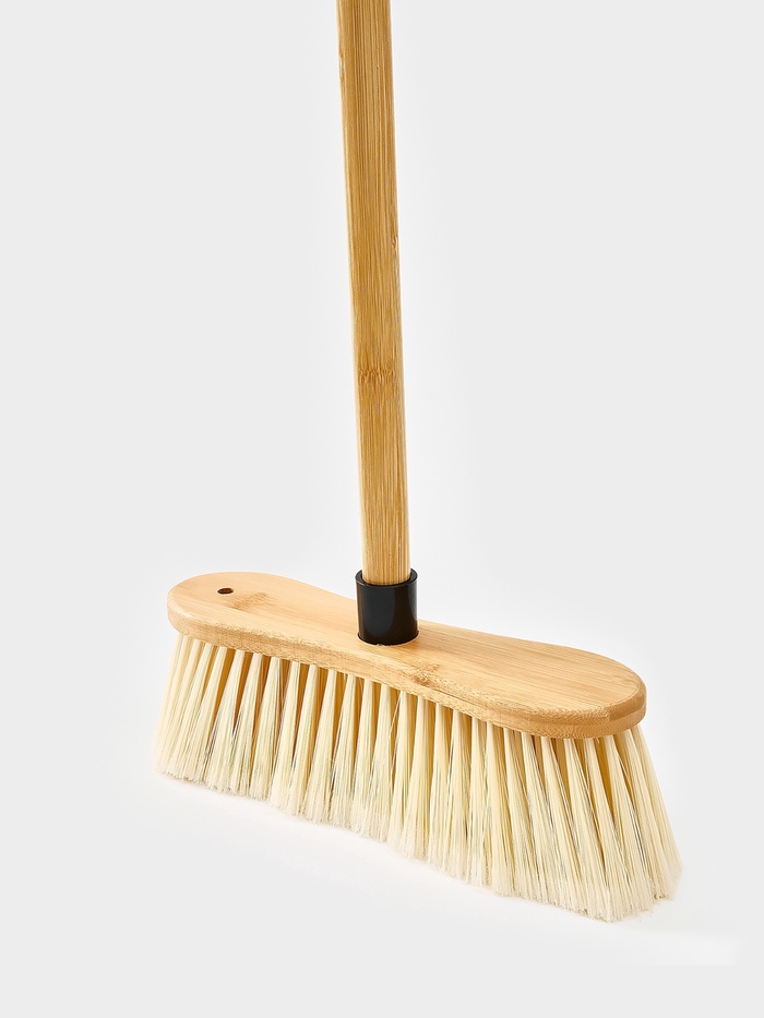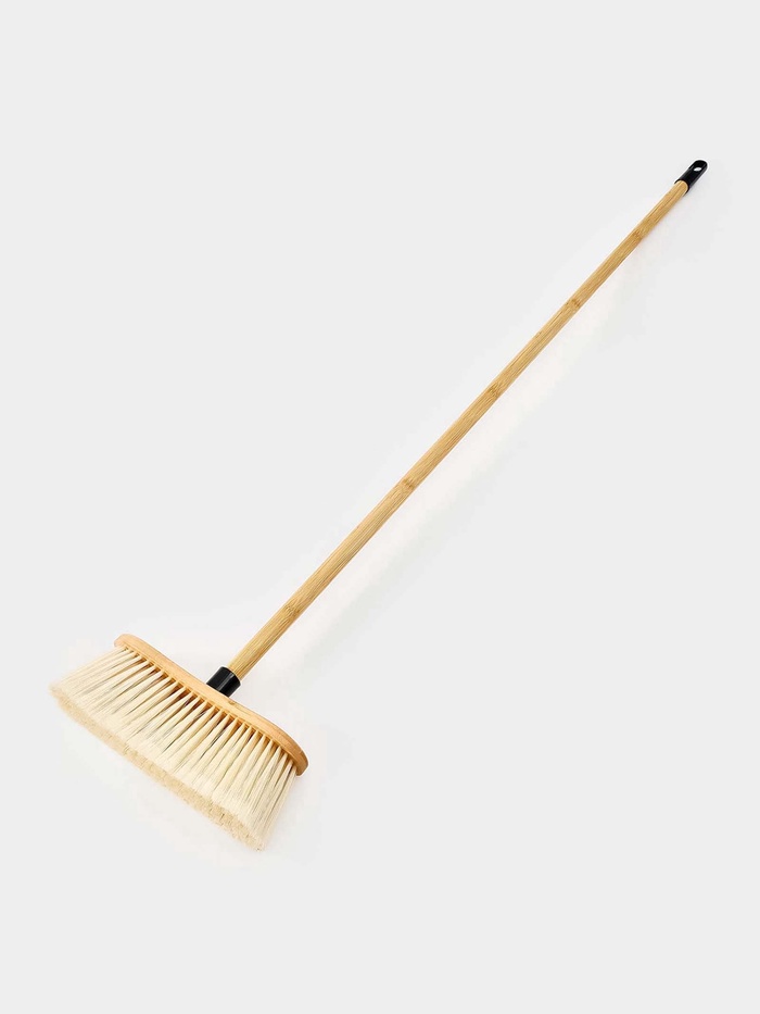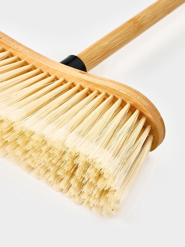 Щётка с бамбуковой ручкой - функциональный инструмент для сухой уборки полов и ковровых покрытий. Деревянная основа и длинный ворс эффективно собирают пыль и шерсть животных с различных поверхностей.