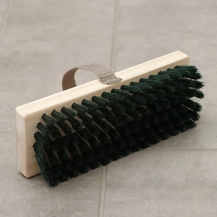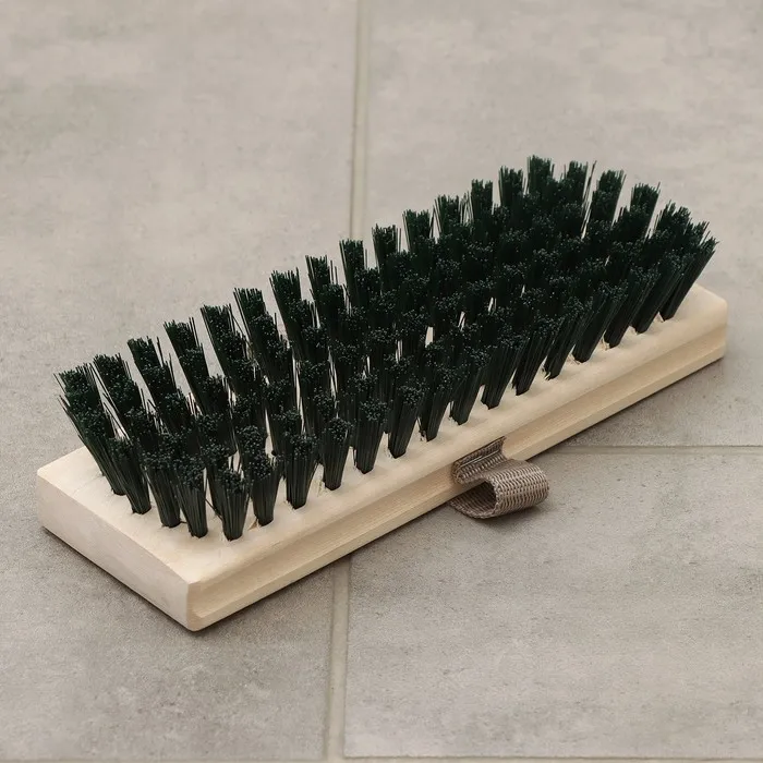 Колодка щётки обработана лаком, что увеличивает срок её службы и защищает от воздействия влаги. Эргономичная форма и ремешок позволяют удобно закрепить щётку в руке.