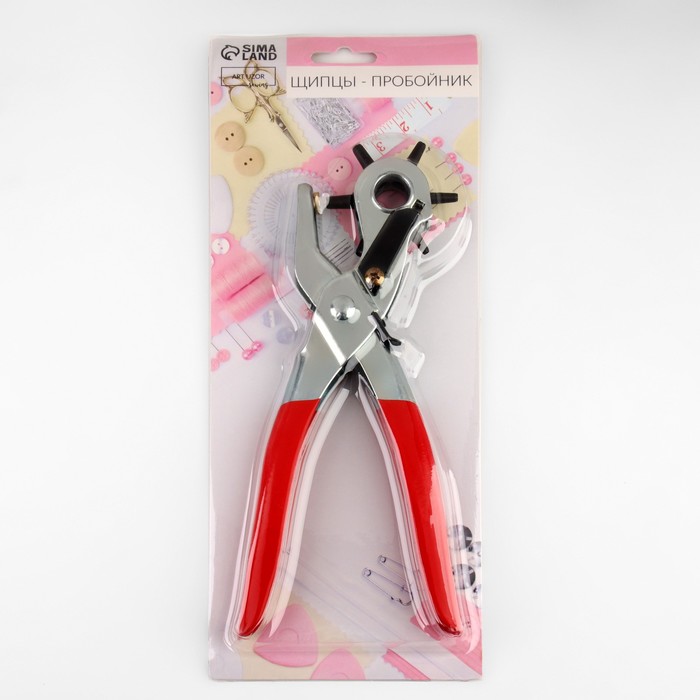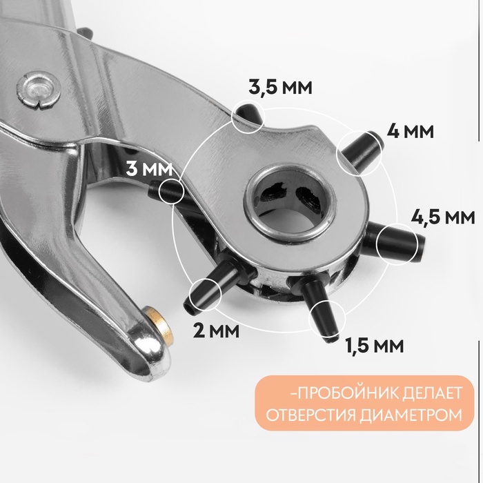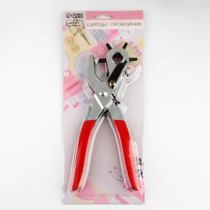 Щипцы предназначены для создания отверстий в плотных тканях, натуральной и искусственной коже. Вращающееся колесо оснащено насадками разного диаметра: от 3 до 5 мм.