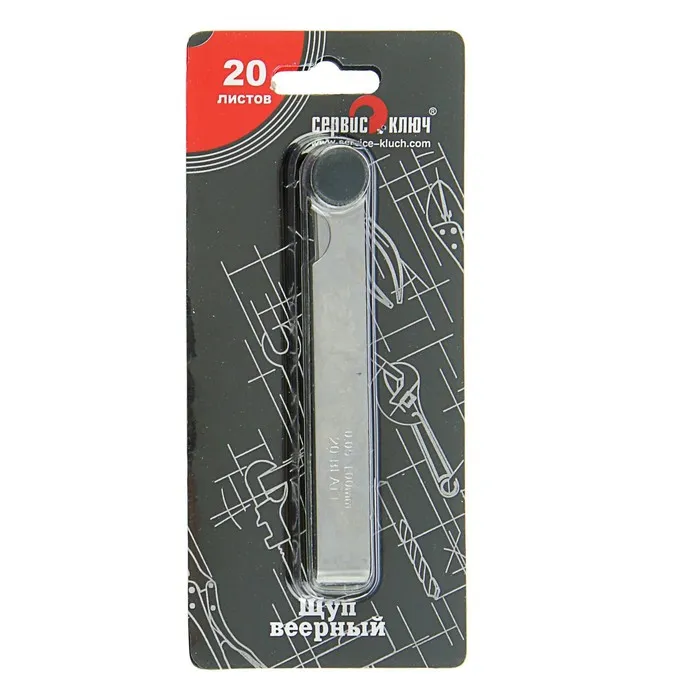 Инструмент имеет диапазон измерений от 0.05 до 1.0 мм с шагом 0.05 мм и состоит из 20 листов. Он поставляется в блистере для удобного хранения и защиты от повреждений.