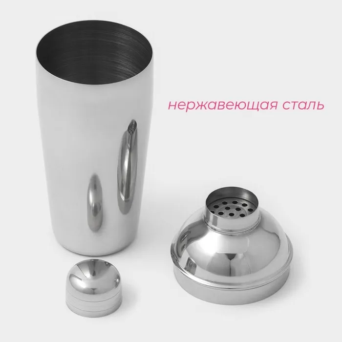 Шейкер изготовлен из качественной нержавеющей стали, состоит из стакана для смешивания, сита для льда и крышки — мерного стакана.