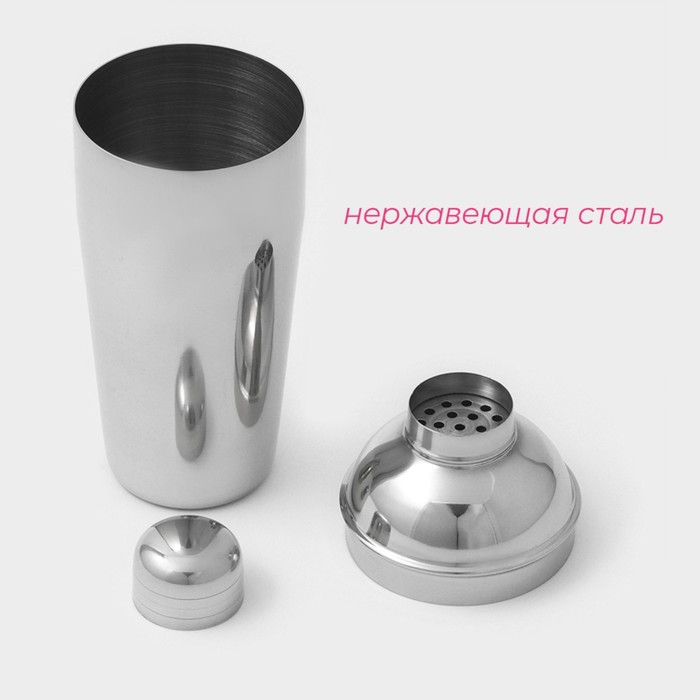 Шейкер изготовлен из качественной нержавеющей стали, состоит из стакана для смешивания, сита для льда и крышки — мерного стакана.
