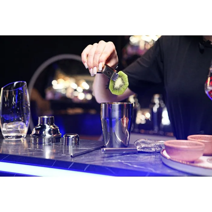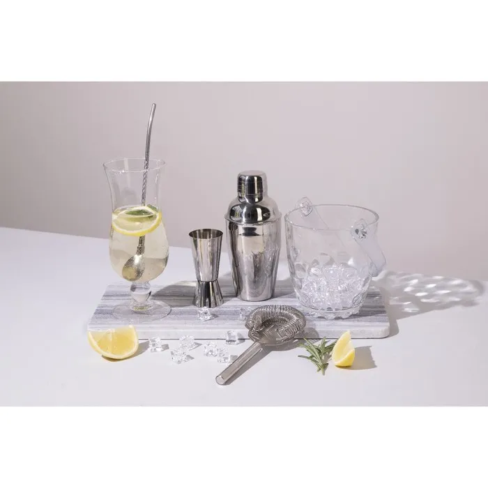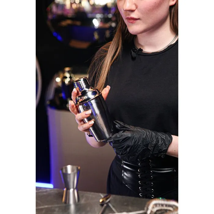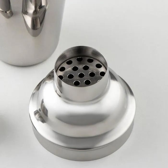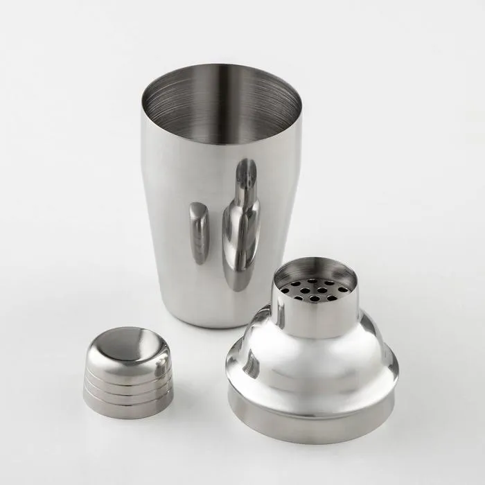 Шейкер изготовлен из качественной нержавеющей стали, состоит из стакана для смешивания, сита для льда и крышки — мерного стакана.