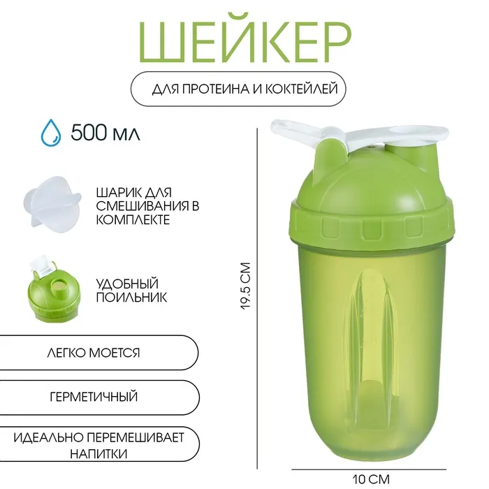 Шейкер спортивный для коктейлей «Мастер К» Best, объемом 500 мл — идеальный выбор для активных людей, стремящихся поддерживать здоровый образ жизни и следить за своим питанием. Этот стильный аксессуар выполнен в ярком зеленом цвете и имеет удобные размеры 19.5х10 см, что делает его легким и портативным.
