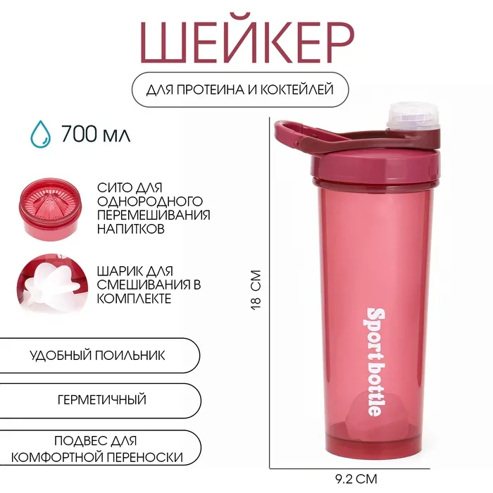 Шейкер спортивный для коктейлей, спортивного питания, 700 мл, PowerPlus, 18х9.2 см, красный — Характеристики
