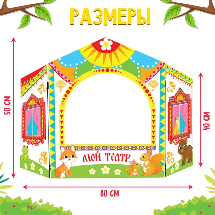 Ширма состоит из двух частей, которые легко соединяются между собой. Игрушка подходит для детей от 3 лет.