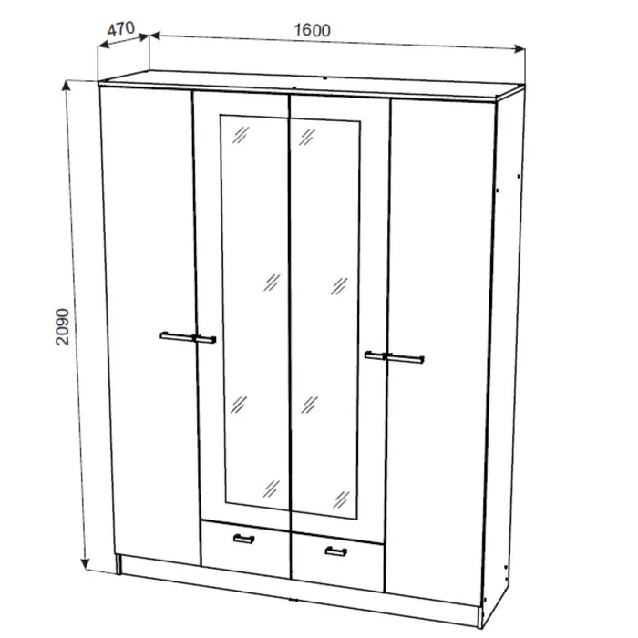 - Имеет внушительные размеры 1600х2095х470 мм, что предоставляет обильное место для хранения вашей одежды, белья, обуви и других предметов.