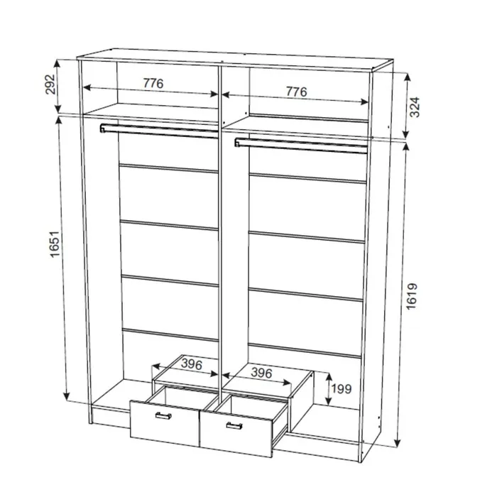 - Оборудован внутренними двумя полками, двумя штангами и двумя выдвижными ящиками, что обеспечивает удобное место для хранения одежды, обуви и аксессуаров.