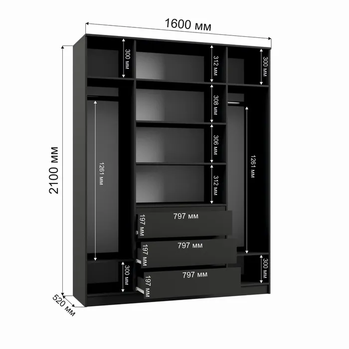 Главный цвет шкафа - графит. Этот насыщенный и глубокий оттенок создает элегантный и современный внешний вид. Графитовый цвет придает шкафу роскошное и изысканное ощущение, что делает его идеальным для разнообразных интерьеров.