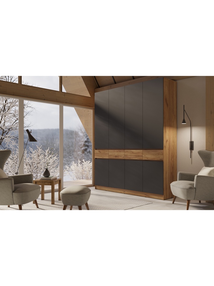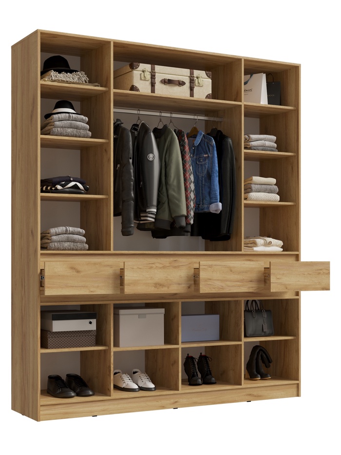 Функциональное решение для хранения одежды и аксессуаров. Продуманная конструкция сочетает штангу для верхней одежды, четыре вместительных выдвижных ящика и систему открытия без выступающих ручек.