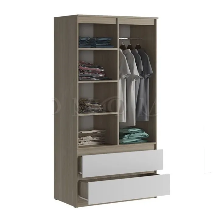 Шкаф 2 - створчатый с ящиками Челси – это функциональный, вместительный и стильный шкаф, который отлично впишется в любой вид интерьера. В наполнение шкафа входит прочная штанга, три удобные полки и два вместительных ящика на роликовых направляющих для хранения различных вещей и предметов.