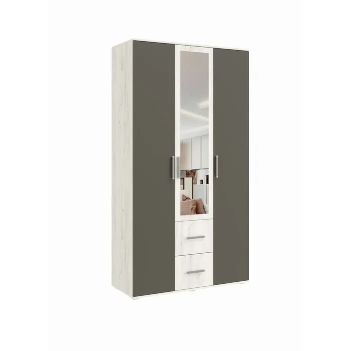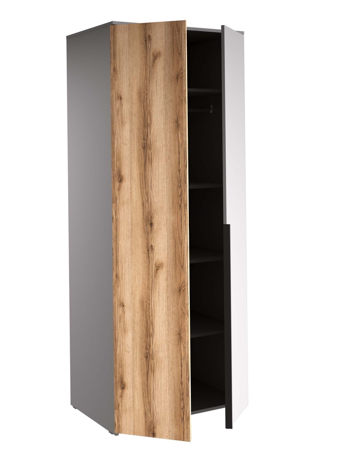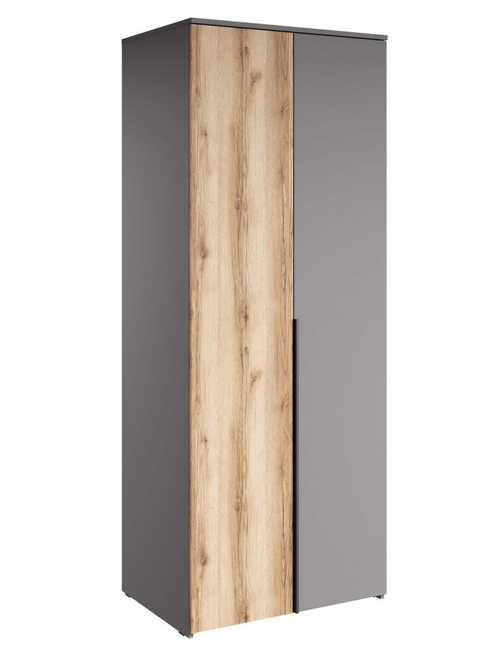 Решение для систематизации гардероба: просторный комбинированный шкаф с двумя дверями. Изготовлен из практичного ЛДСП в элегантном сочетании цветов дуб делано и серый шифер.