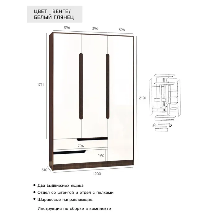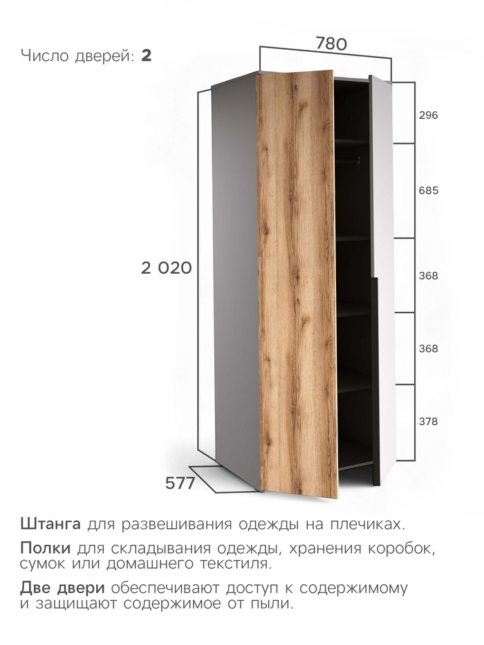 - Вместительное хранение: габариты и продуманная компоновка (полки + штанга) предоставляют достаточно пространства для одежды, обуви, аксессуаров, постельного белья или сезонных вещей.
