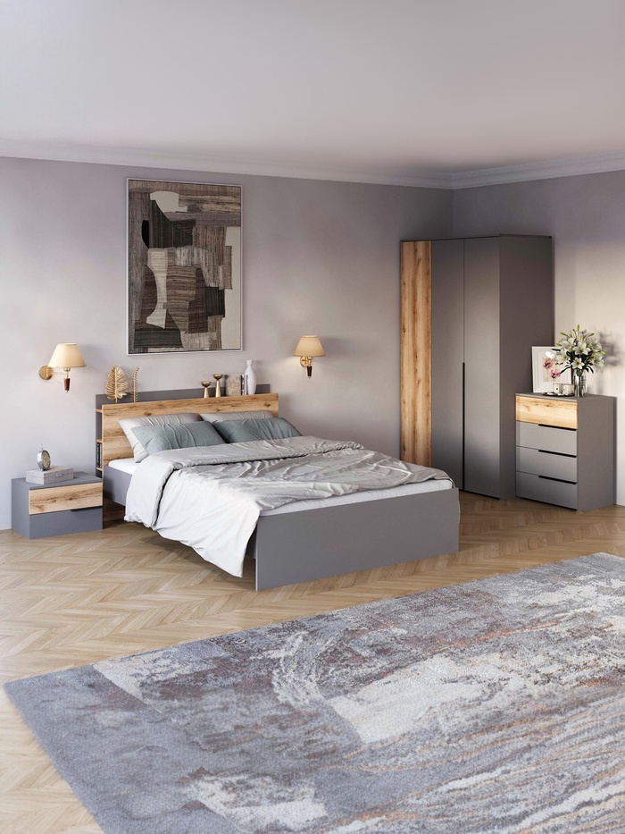 - Современный комбинированный дизайн: сочетание текстур и оттенков дуб делано и серый шифер создает стильный акцент в интерьере. Лаконичные фасады подчеркивают современный вид.