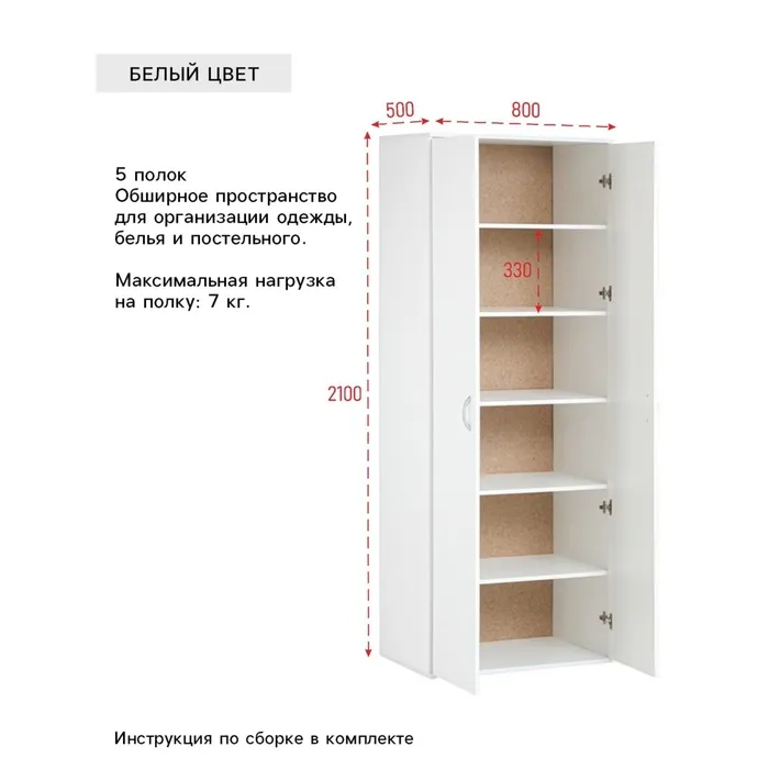 Шкаф 5 полок, 800х500х2100, Белый - вместительный и функциональный. Выполнен из экологически чистых и качественных материалов. Шкаф предоставляет обширное пространство для организации одежды, белья и других предметов.
