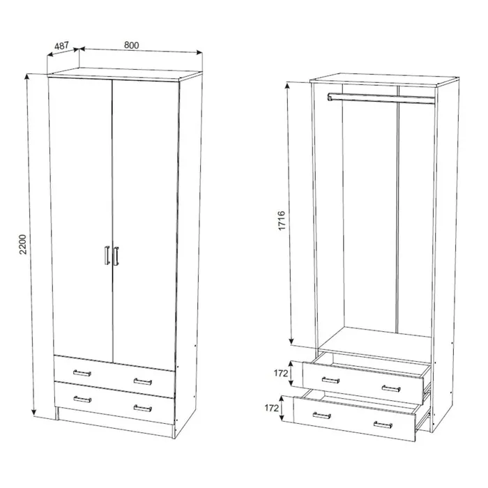 - Имеет удобные размеры 800х480х2200 мм, что предоставляет обильное место для хранения: одежды, белья, обуви и других предметов. С двумя дверьми, обеспечивает удобный доступ к вашим вещам.