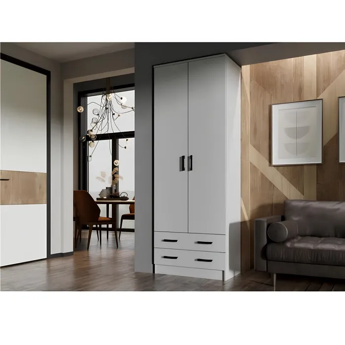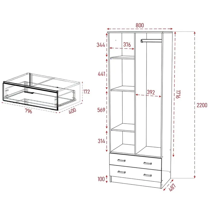 - Имеет удобные размеры 800х480х2200 мм, что предоставляет обильное место для хранения: одежды, белья, обуви и других предметов. С двумя дверьми, обеспечивает удобный доступ к вашим вещам.