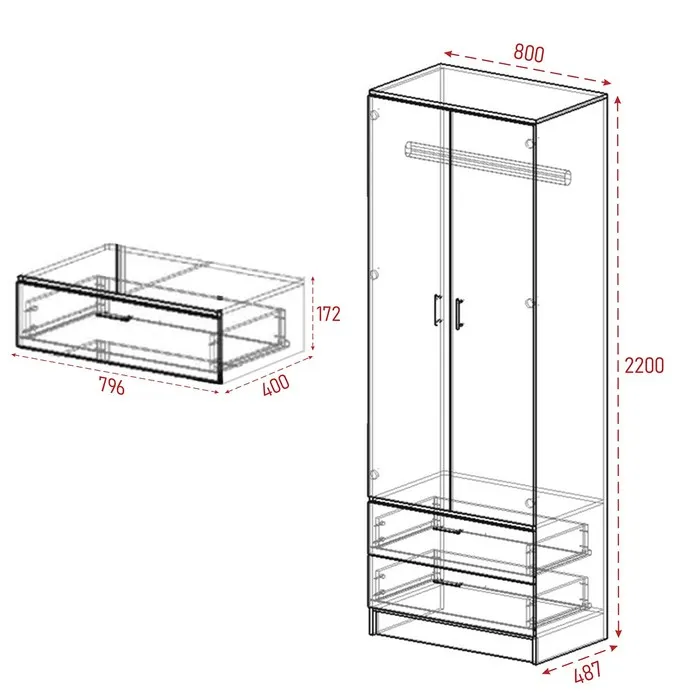 - Имеет удобные размеры 800х480х2200 мм, что предоставляет обильное место для хранения: одежды, белья, обуви и других предметов. С двумя дверьми, обеспечивает удобный доступ к вашим вещам.