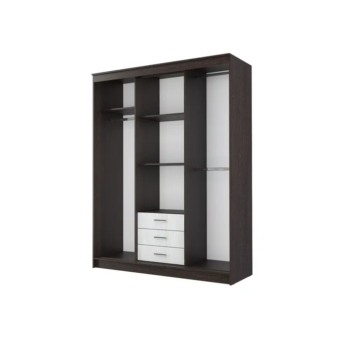 Шкаф-купе Лорд - это воплощение гармоничного и современного стиля, а его дизайн придает интерьеру глубину и динамику. Шкаф-купе имеет три вертикальных отделения, два из них по краям оснащены раздвижными дверцами с зеркалами. Отделение по середине имеет распашные фасады, а ниже три выдвижных ящика.