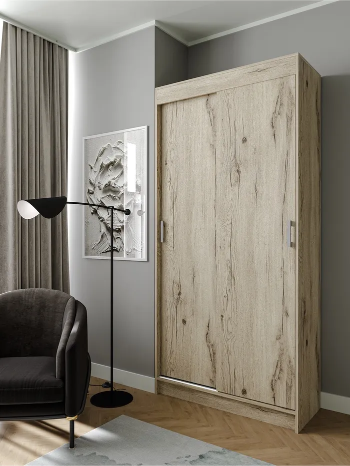 С размерами 1000×418×2100 мм, изготовлен из ЛДСП в оттенке дуб крафт серый, что придает ему современный актуальный вид. Шкаф оснащен двумя дверями, что обеспечивает достаточно места для скрытого хранения. В комплект входят полки и штанга, что позволяет удобно разместить ваши вещи в зависимости от предпочтений.